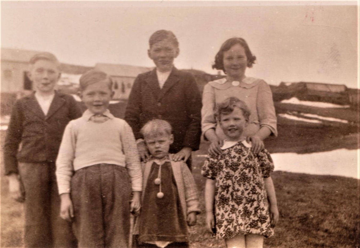 6 börn uppstilt, frá vinstri eru það Sigurður Benediktsson, Lýður Benediktsson, Grímur Benediktsson og Aðalheiður Björnsdóttir. Börnin tvö fyrir framan þau eru Rósa Jónída og Guðfríður Guðjónsdóttir.