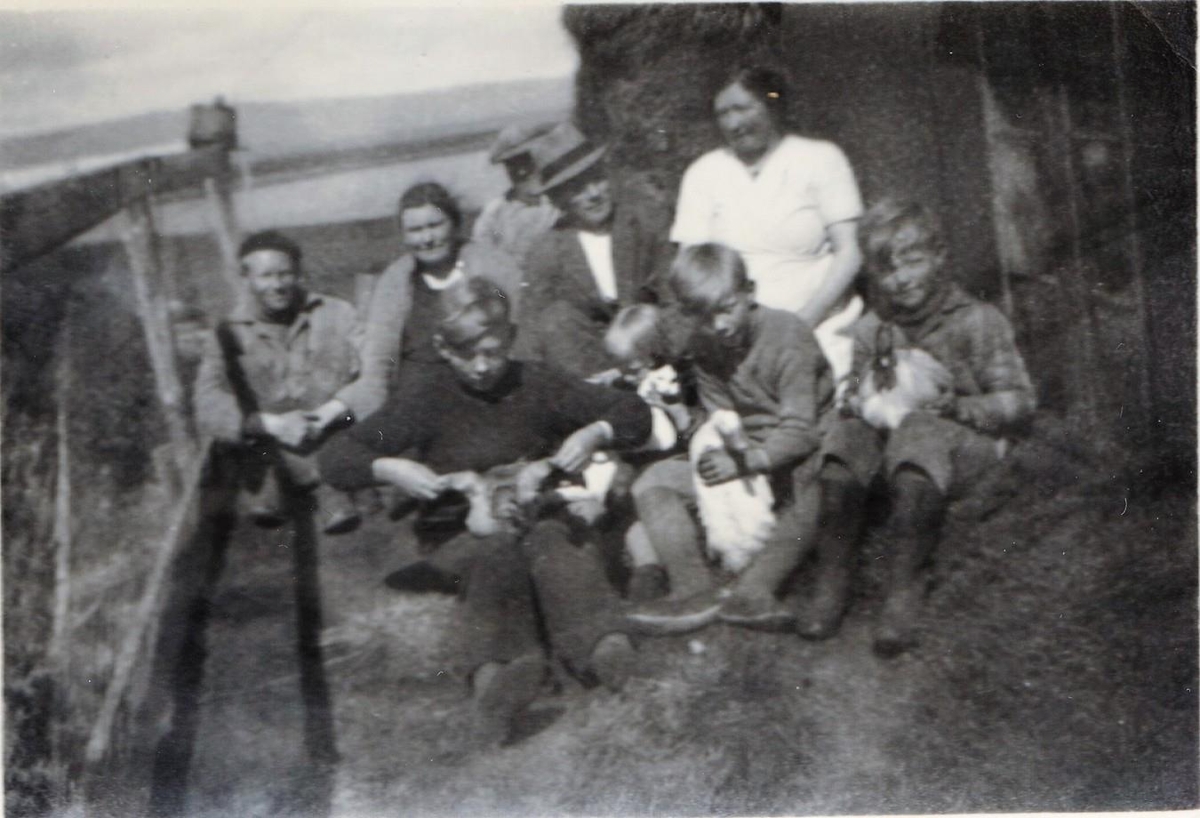 Aftan á mynd stendur "Alli á Klúku, Rúni í Nautavík, Gogga, pabbi, mamma, Grímur, Sigurður (Diddi), Lýður og Rósa með heimilisdýrin".