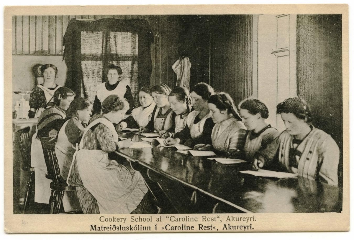 Hópur ungra kvenna situr við aflangt borð og skrifa þær á blöð. Tvær ívið eldri konur standa við borðsendann, líklega leiðbeinendur í námskeiðinu. Undir myndinni stendur: Cookery School at "Csroline Rest", Akureyri. / Matreiðsluskólinn í „Caroline Rest“,Akureyri.