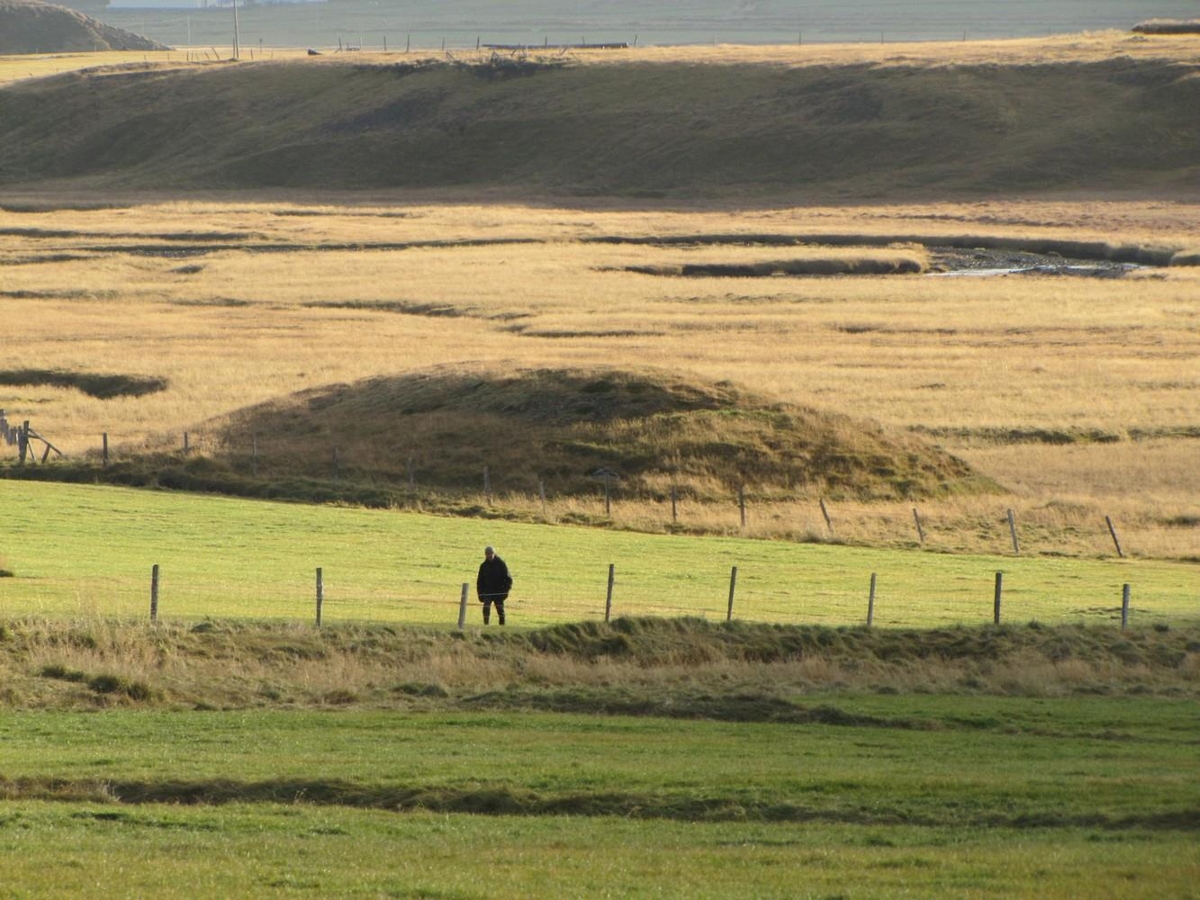Tekið við Steinadal í Kollafirði. Bóndinn gengur heim gamla veginn. Birgishóll í baksýn.
