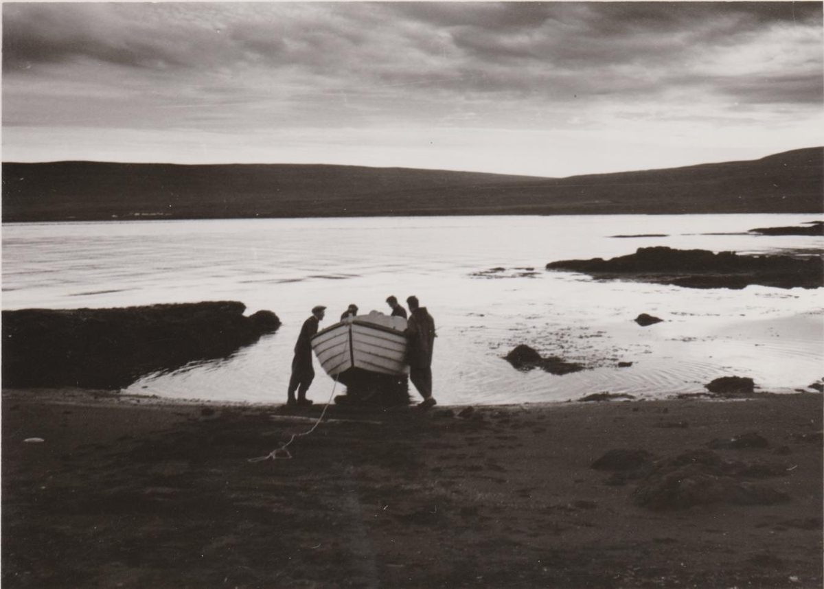 Bátur lagður til sjós úr fjörunni.