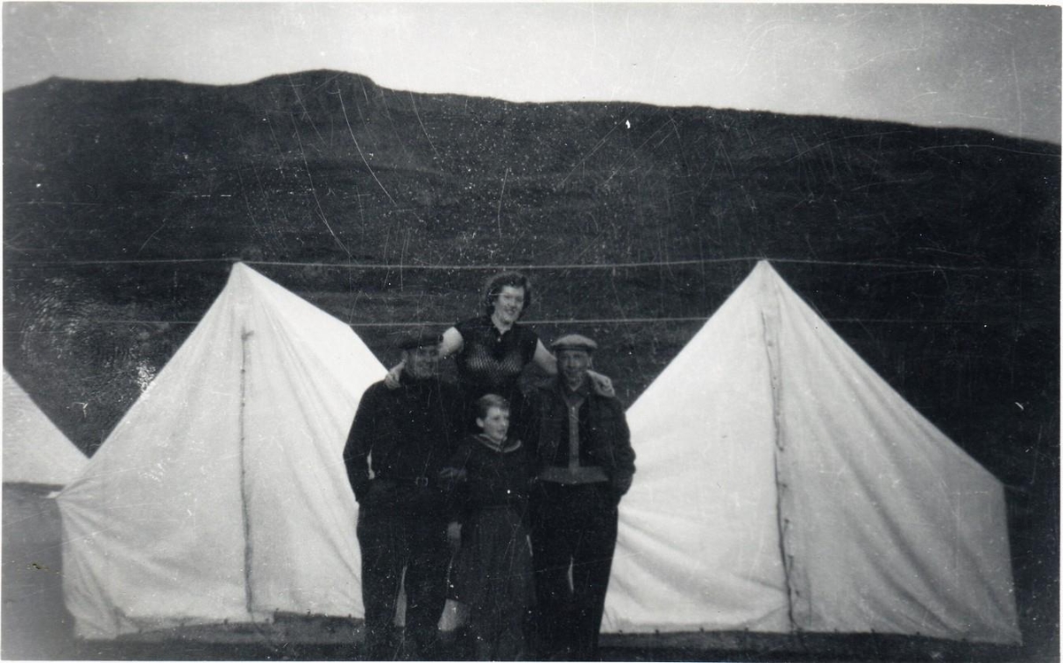 4 manneskjur stilla sér upp fyrir framan tjaldbúðir.