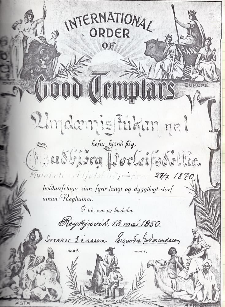 Innrammað heiðursskjal Guðbjargar i Múlakoti frá Góðtemplurum 1950. Myndin er ljósrit af skjalinu