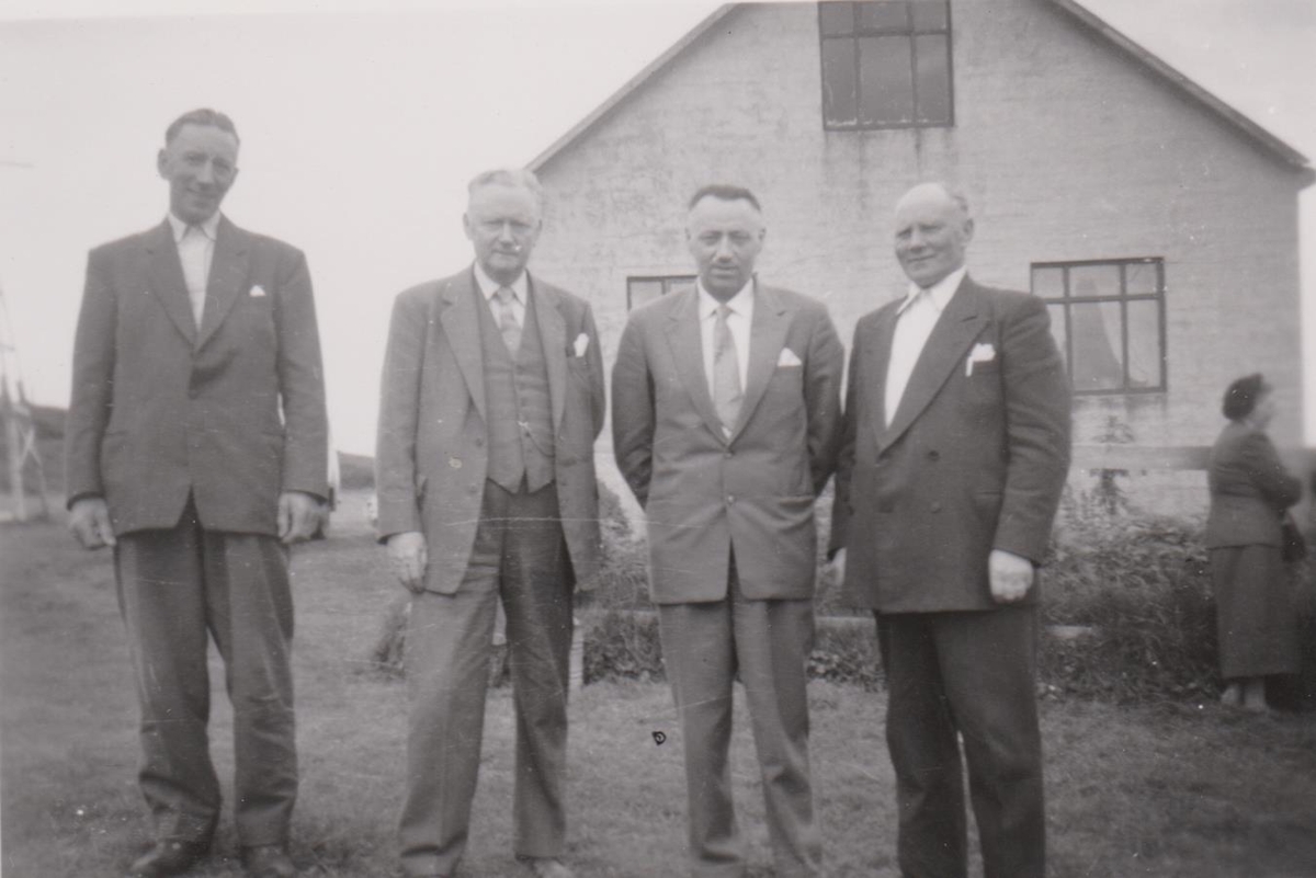 4 menn fyrir framan íbúðarhús.