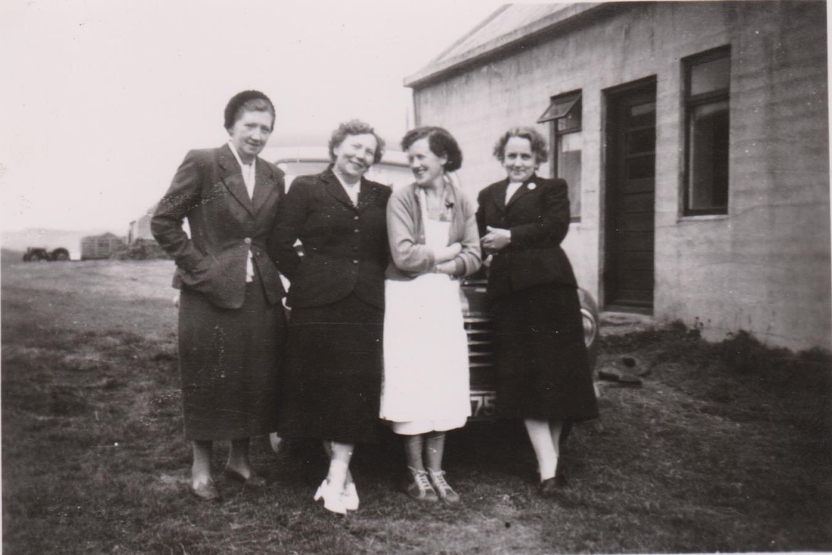4 manneskjur fyrir framan fólksbíl. Ekki sést í nema hluta úr bílnúmerinu en sá hluti er 75.