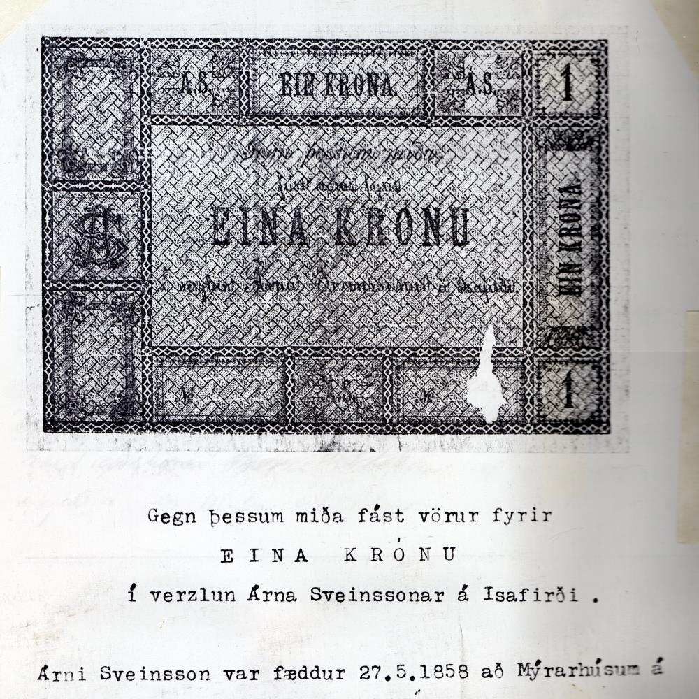 Miði sem á stendur að hann gildi sama og ein króna í Verslun Árna Sveinssonar á Ísafirði. Haraldur fékk miðann á Ísafirði 1935.
