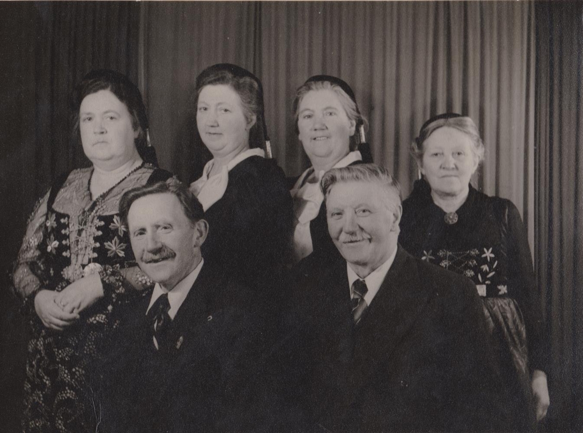 6 manneskjur stilla sér upp í þjóðbúningum.