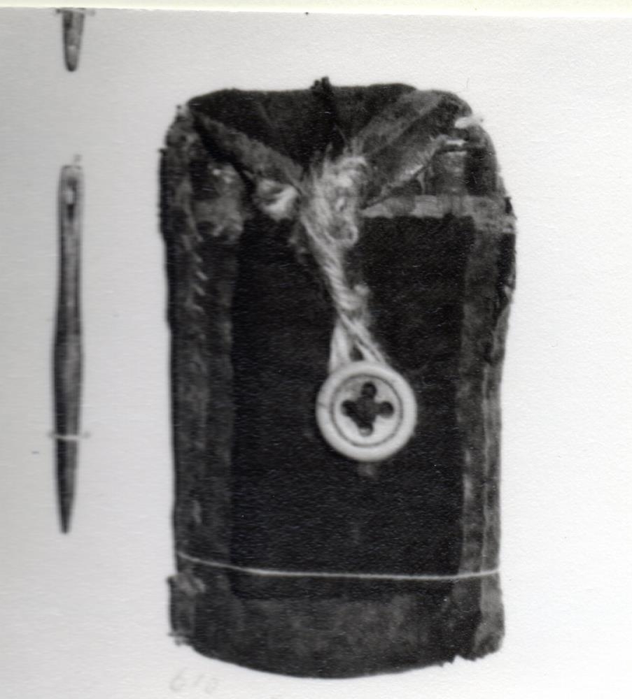 Nálarprilla úr svörtu taui og skinni með 5 leggjum úr álftafjöðrum. Hneppt aftur með stórri beintölu. Sonur Ástríðar gaf Haraldi 15.7.1955