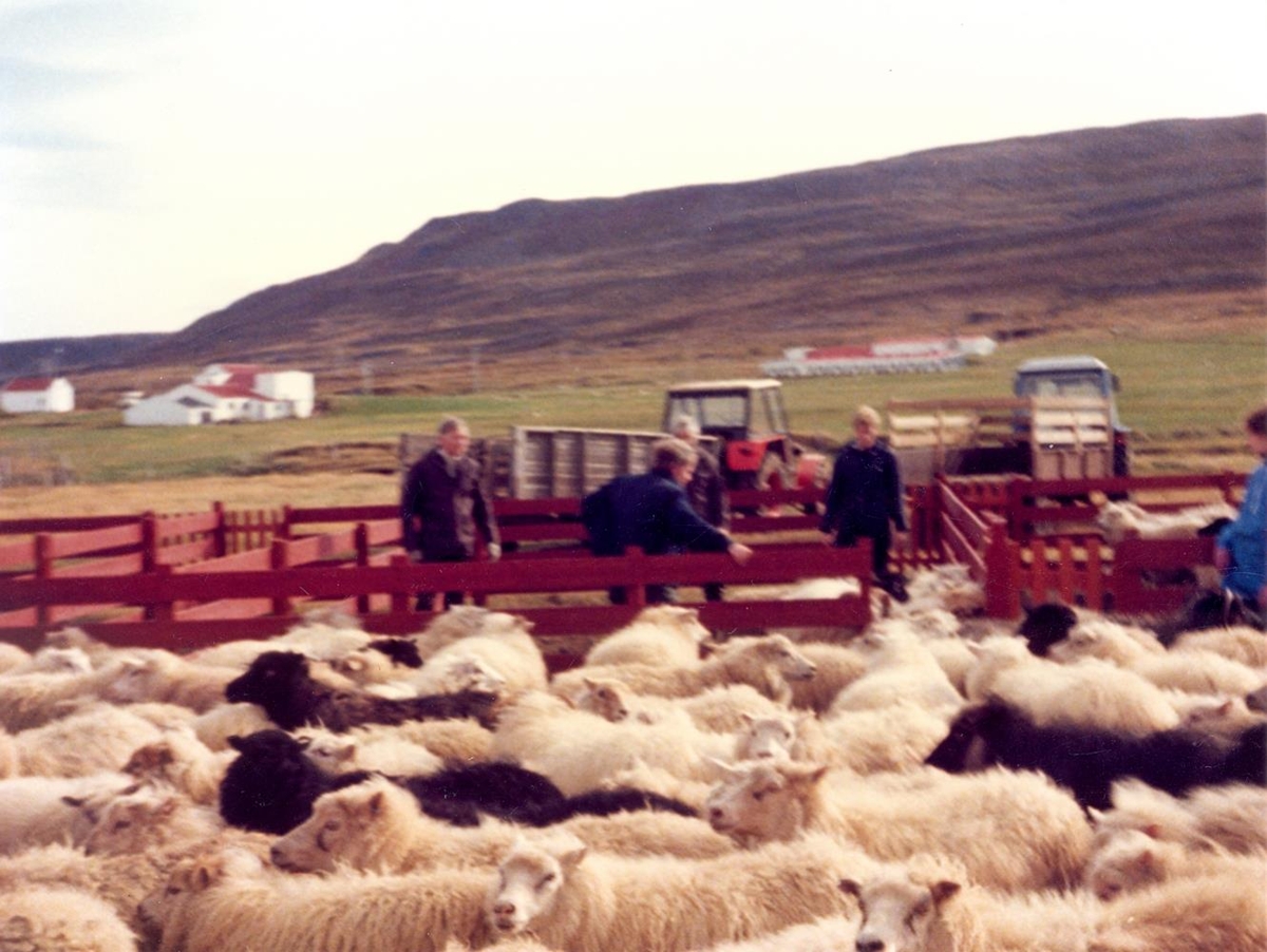 Réttað í Kirkjubólsrétt. Myndin er tekin úr almenningnum í átt að Kirkjubóli, fjórar manneskjur að reka í lamenninginn úr fjárhólfi.