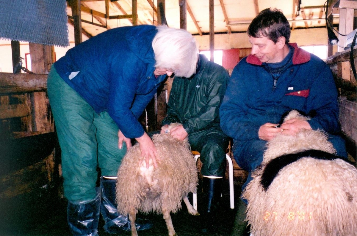 Jón Viðar Jónmundsson sauðfjárræktarráðunautur Búnaðarsambands íslands að dæma lömb í Húsavík. "Íhaldsmennirnir" eru Brynjólfur Sæmundsson ráðunautur á bak við Jón Viðar og Guðbrandur Björnsson á Smáhömrum.