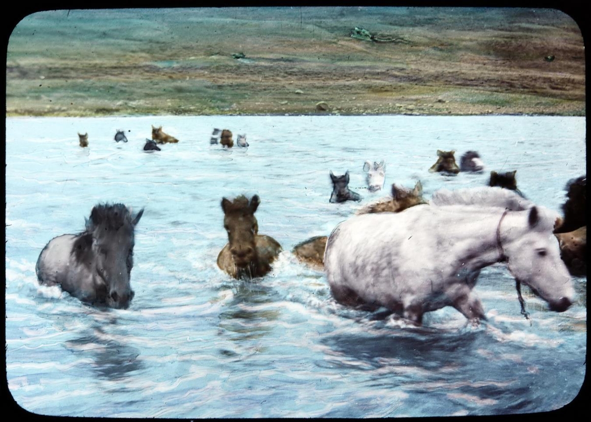 Hópur hesta að taka land eftir sund yfir stöðuatn eða fjörð.