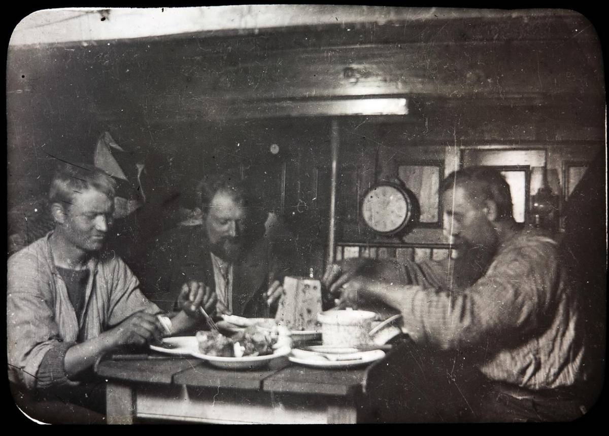 „Líklega breskir sjómenn í káetunni á kútter Talisman á leiðinni til Íslands, sbr. aðrar myndir Throups.“ (BÞ 2017)