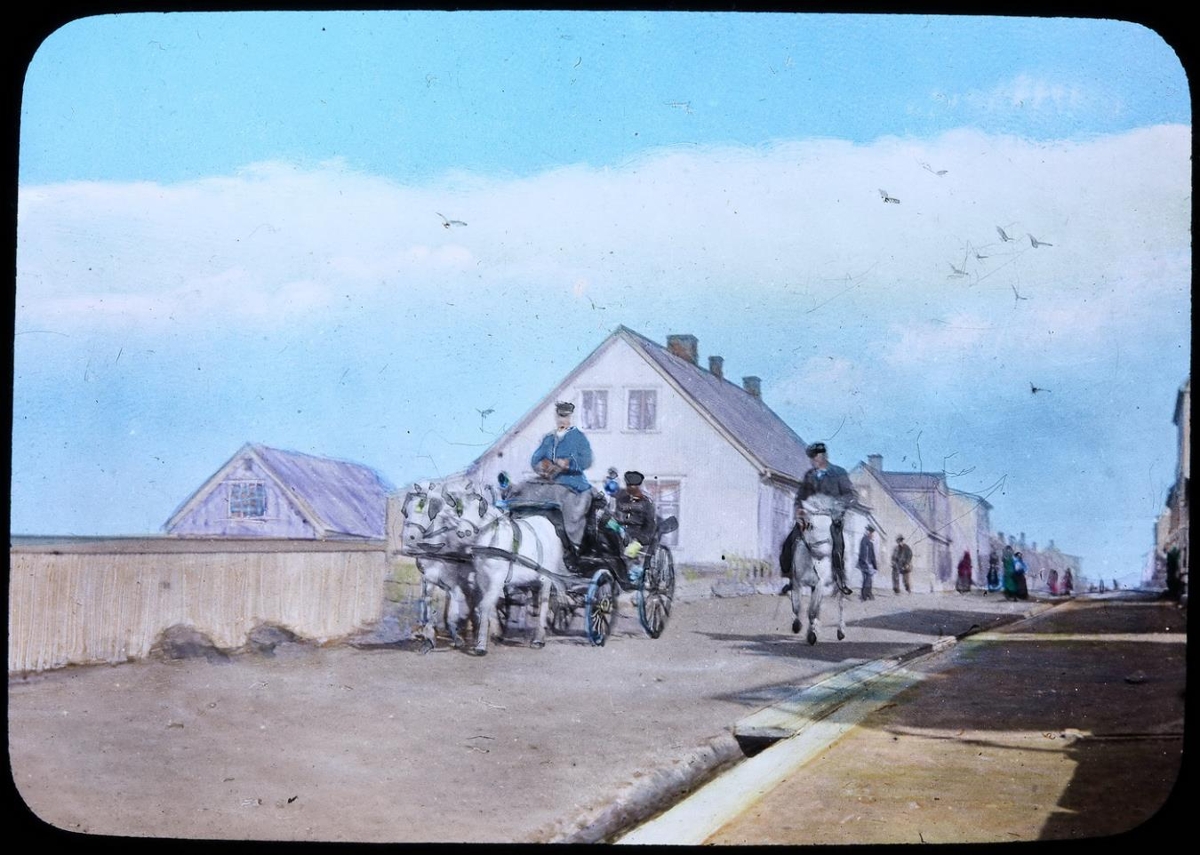 Tvíæki með opna farþegakerru með ökumanni og amk. einum farþega og reiðmaður á hesti á leið niður Bakarabrekku/Bankastræti, gangandi vegfarendur ofar í götunni.
