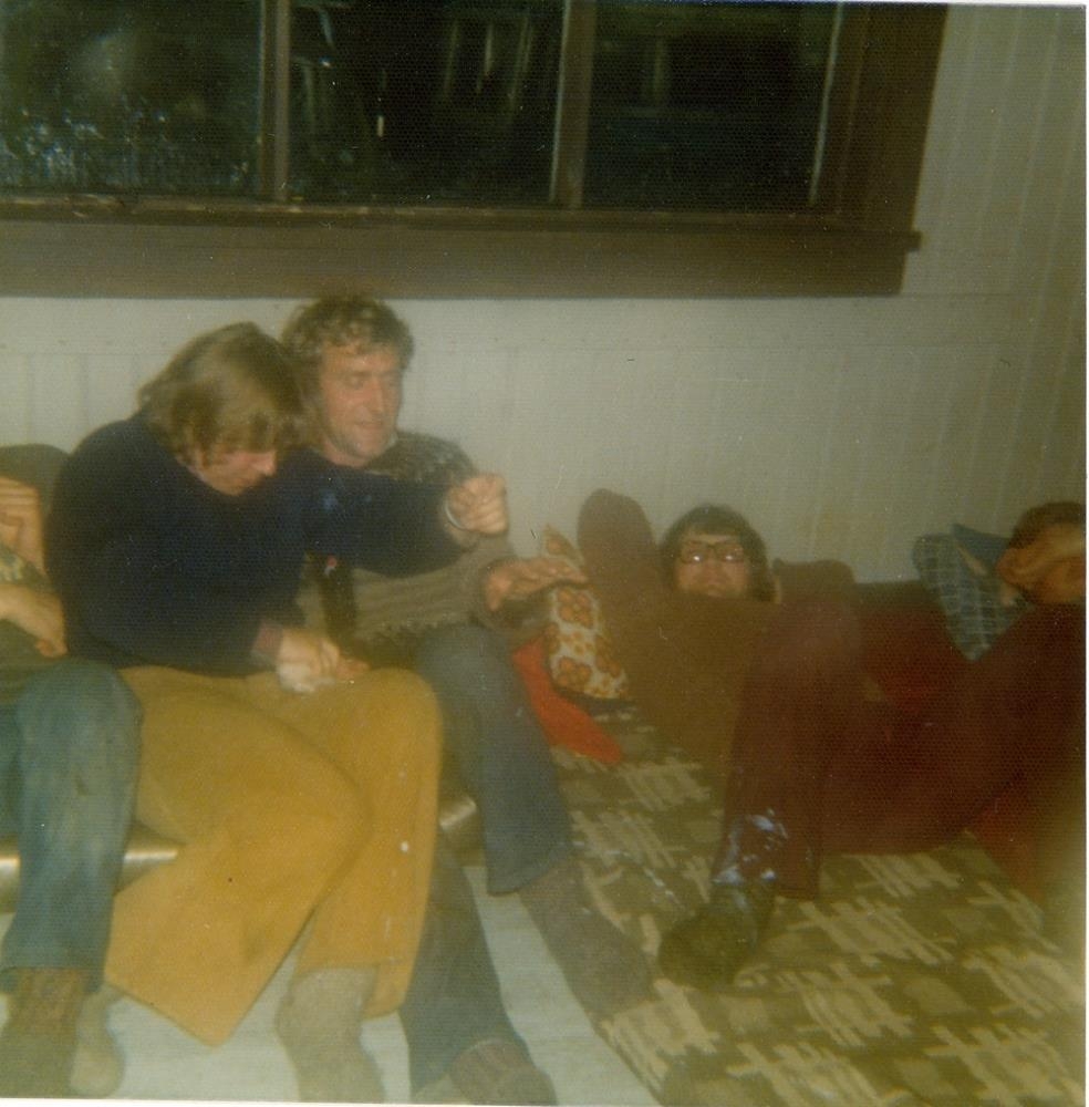 Slátursvinna í sláturhúsi KBÓ árið 1975. Á myndinni hvílast í fundarhúsinu þeir Einar Indriðason, Einar Eysteinsson og Guðfinnur Finnbogason. Fundarhúsið var aðsetur sláturhúsmanna, fyrr var gist í því.