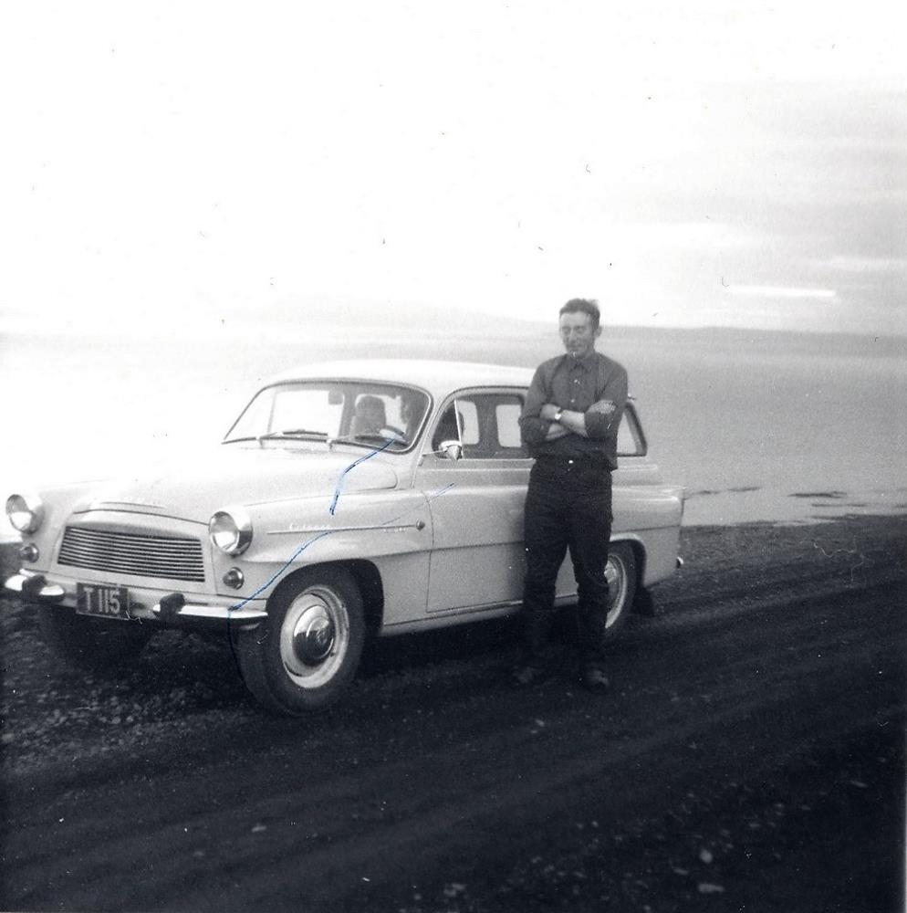 Indirði Sigmundsson við fólksbíl með númerið T-115.