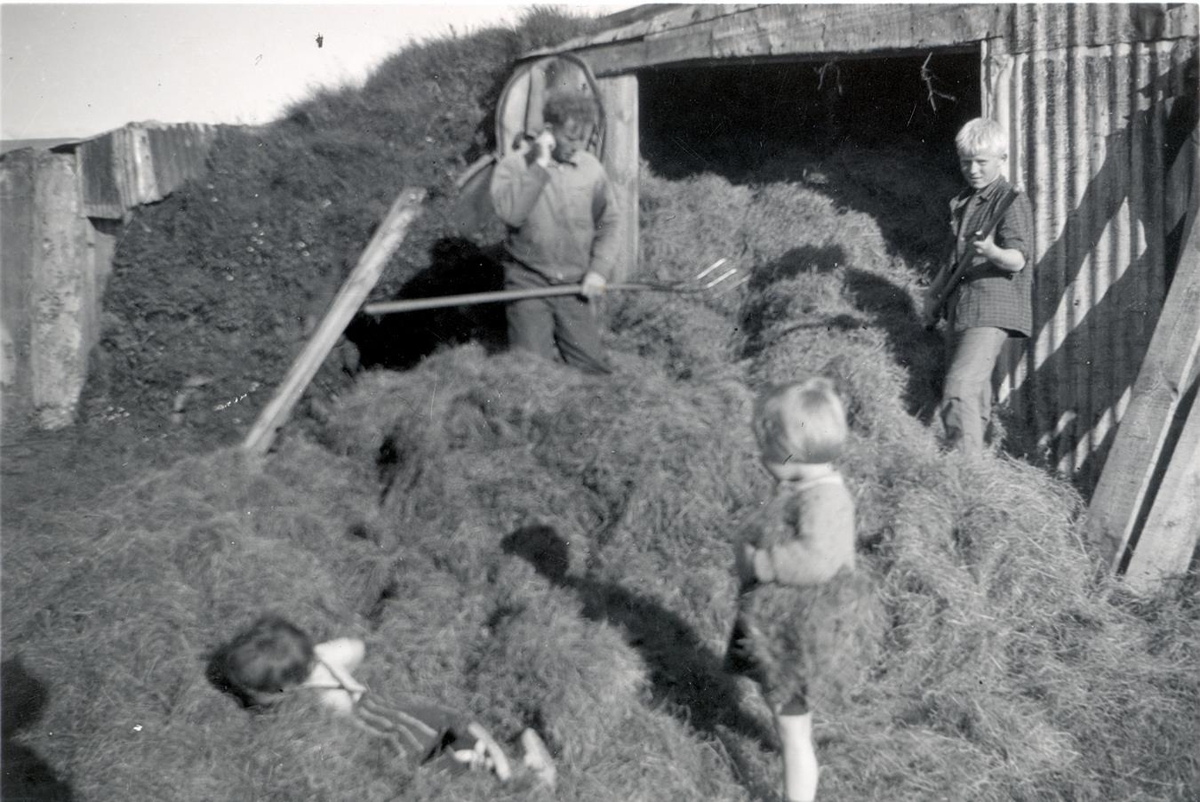 Jón Gústi mokar heyi í hlöðuna sem var áföst íbúðarhúsinu í Steinadal. Gísli Guðjónsson hægra megin, Hrafnhildur og Svanhildur leika sér í heyinu. Í baksýn vinstra megin glittir í fjósþakið, fjósið var sambyggt hlöðunni.