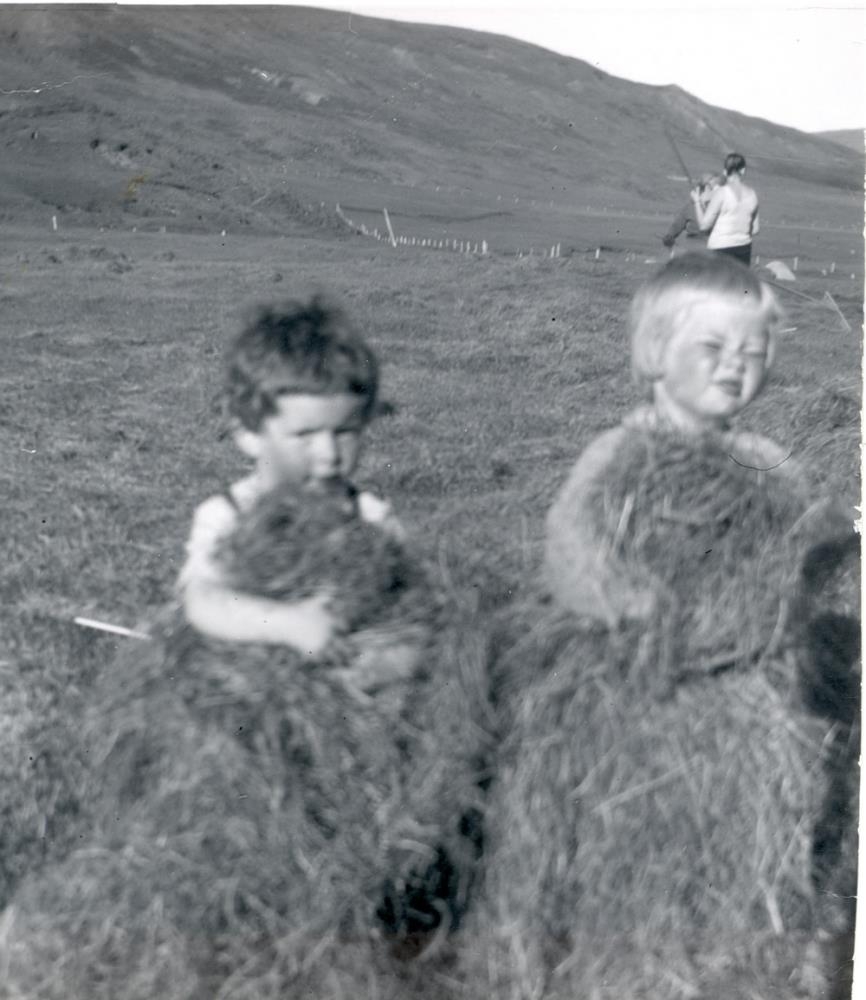 Hrafnhildur og Svanhildur að heyja, Í baksýn er Svanborg Gísladóttir fjær og Sigrún Ólafsdóttir Sigurjónssonar nær. Hún var í sveit fyrstu búskaparárin, alla vega fjögur ár.