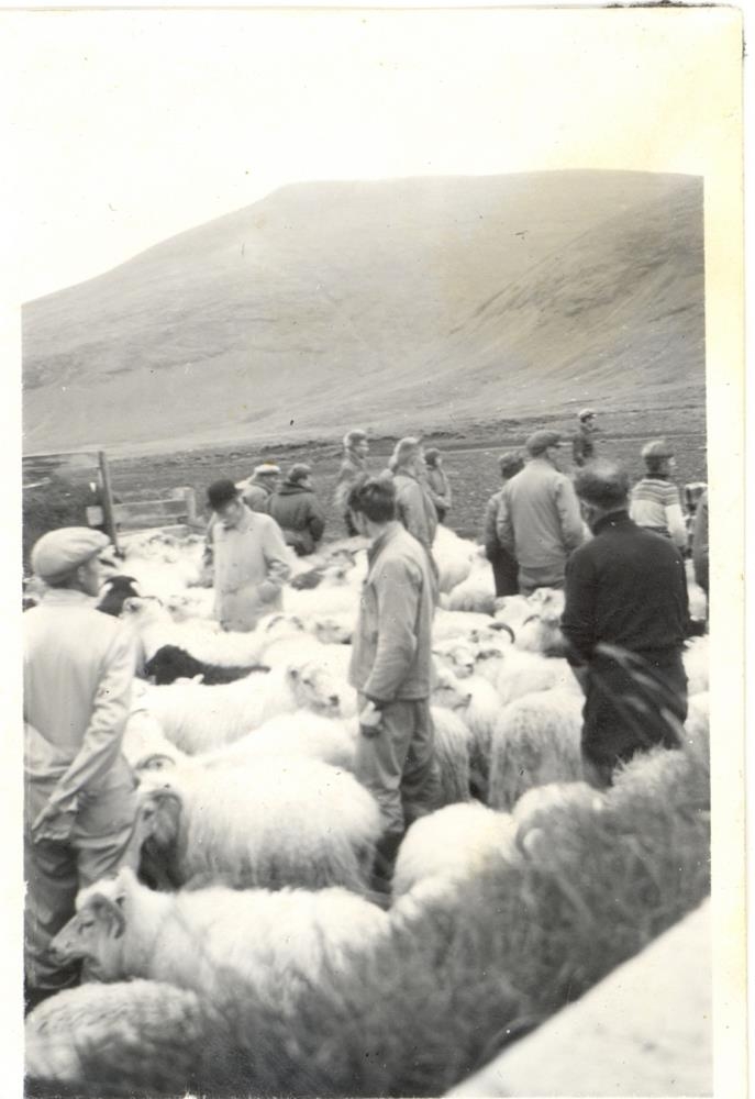 Í Fellsrétt á Miðhúsamelum. Frá vinstri Alfreð Halldórsson, Sr. Jón Brandsson, Sigurður Franklínsson í baksýn við prestinn, Jónatan Aðalsteinsson fyrir miðju og þá Jón Jónsson á Broddanesi.