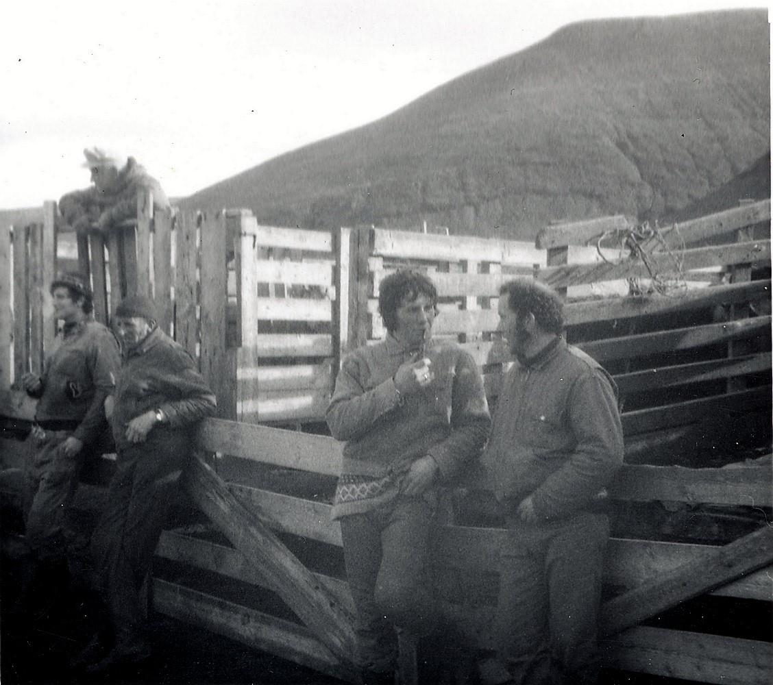 Í Fellsrétt í Kollafirði á Ströndum. Guðjón Haraldsson sumarmaður á Broddadalsá, Brynjólfur Jónsson í vagninum, Gunnar Sæmundsson, Jón Stefánson með pípu og Jón Gústi Jónsson.