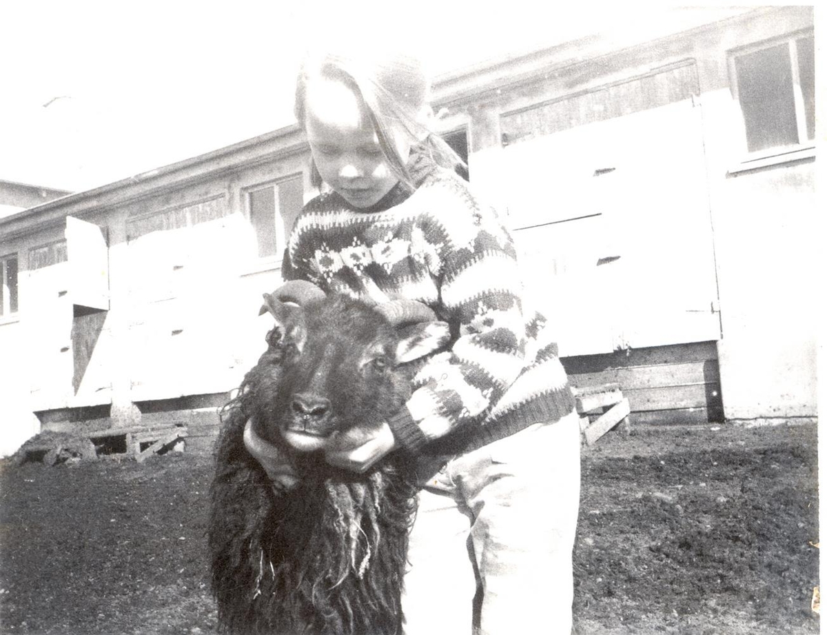 Salbjörg Engilbertsdóttir með kindinni Kibbu fyrir utan gömlu fjárhúsin á Tirðilmýri við Snæfjallaströnd. Kibba var spök og fremur smávaxin, hélt að hún væri forystusauður.
