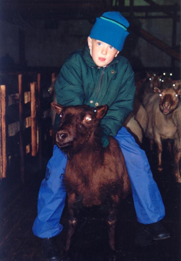 Guðjón Hraunberg Björnsson á Grund á bakinu á svartri kind.
