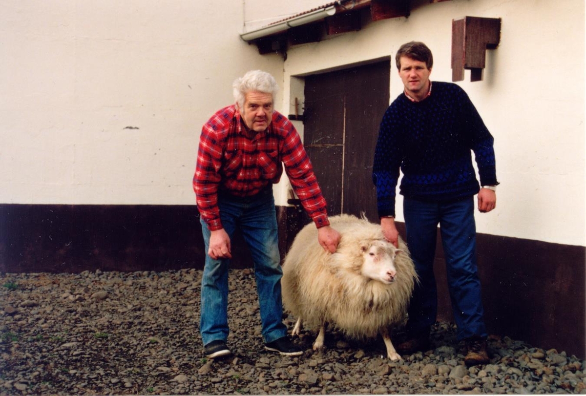 Feðgarnir Páll Traustason og Björn Pálsson halda í vænan hrút fyrir utan fjárhúsin á Grund.