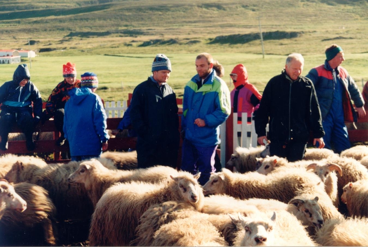 Myndir teknar í Kirkjubólsrétt. Mikið af fólki í réttinni, Vignir Pálsson og Benedikt Sigurðsson fyrir miðri mynd.