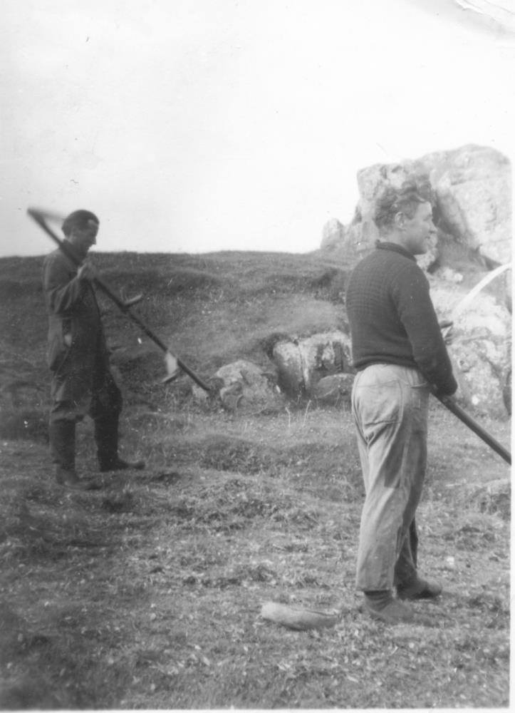 Tveir menn við slátt, Halldór er aftar og Brynjólfur framar. Þeir halda á orfunum, virðast hafa verið að brýna.