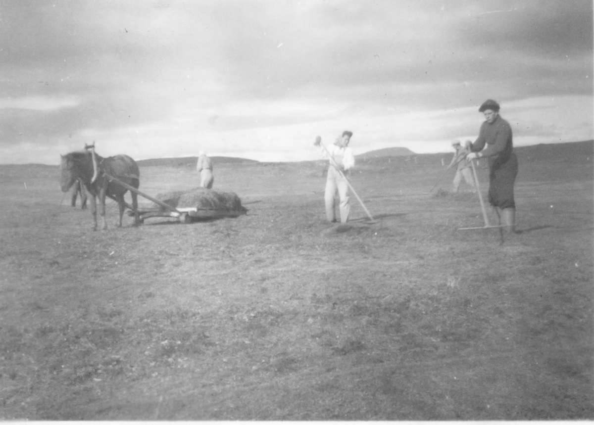 Fimm manns að raka saman heyi. Viggó og Svava. Kerruhestur með heyhlass á fleka.