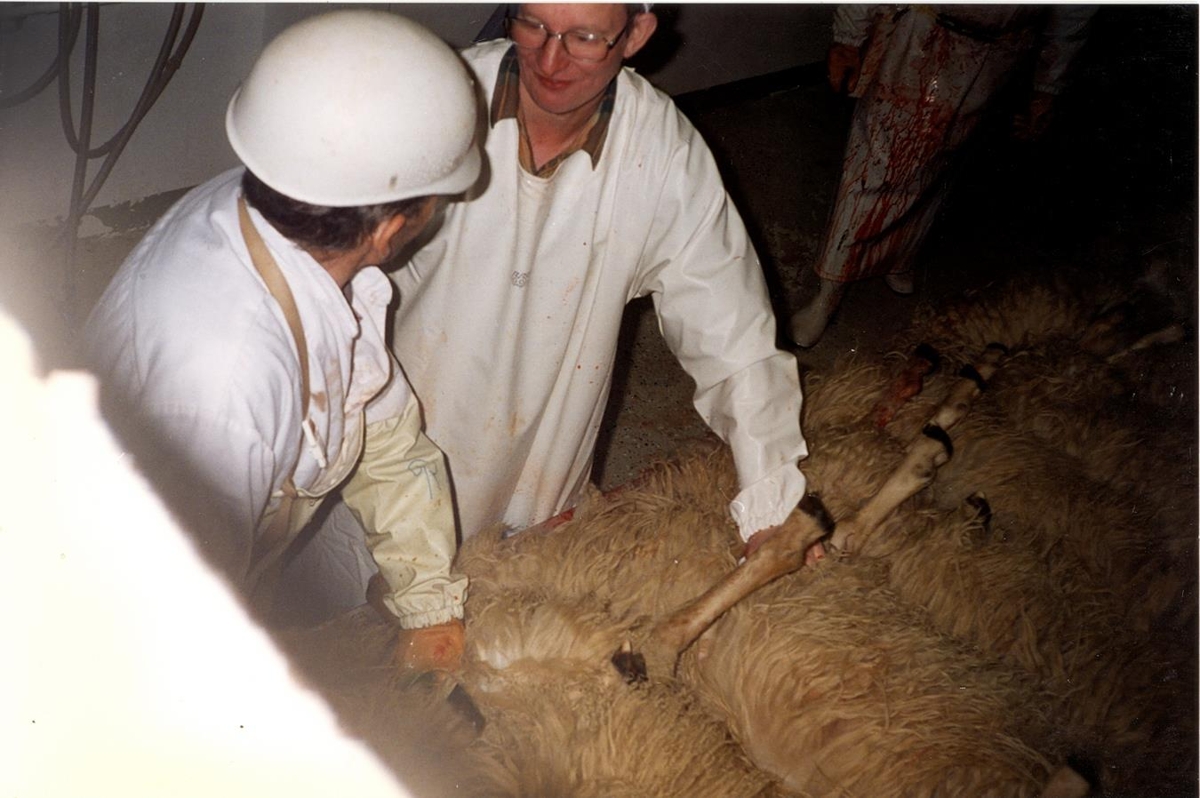Einar Einarsson á orð við Ragnar Elísson. Tekið í sláturhúsinu á Borðeyri.