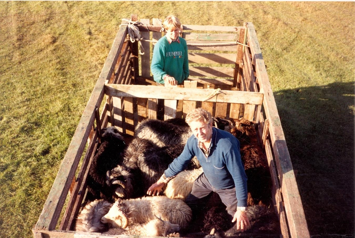 Jón Loftsson búinn að klifra upp í vagnin til kindanna. Haraldur stendur á bakvið.