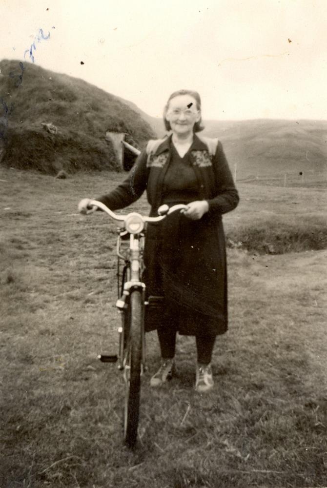 Jóhanna Sigmundsdóttir Knudsen á Einfætingsgili í Bitru, myndin er tekin á Litla-Fjarðarhorni í Kollafirði haustið 1953. Hjólið var afmælisgjöf til Ásdísar Jónsdóttur 10 ára. Kofinn á Litla-Fjarðarhorni er torfhúsið í baksýn.