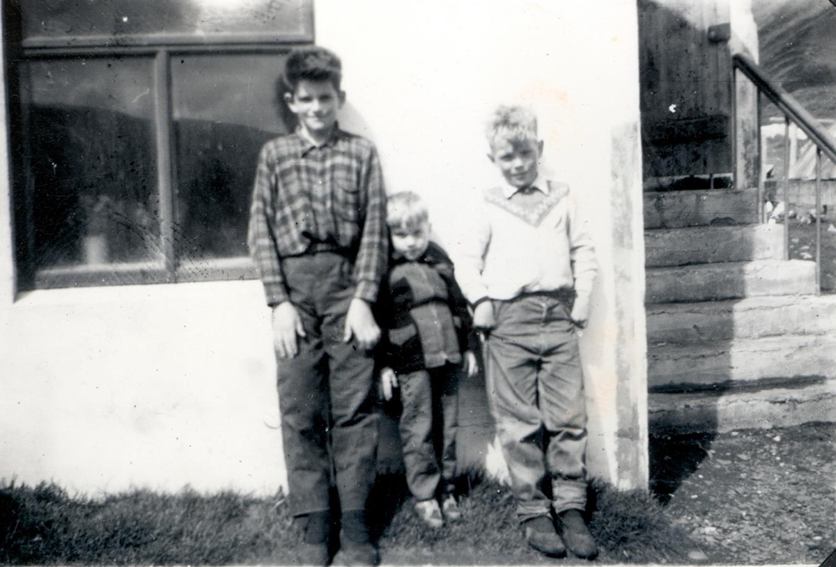 Þrír drengir við íbúðarhúsið á Gili í Bitru. Villi Roy sem var í sveit á Gili er lengst til vinstri, Einar Indriðason og þriðji er óþekktur.