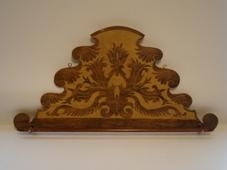 Handklæðagrind úr viði með útskurði. Grindin er þríhyrningslaga en í brúnum tveggja hliða er munstur. Við neðri brún brettisins og 5 cm. frá hvorum enda eru 3 cm. langir trépinnar og á þá er nelgd 60 cm. löng sívöl spíta. Einnig eru við neðri brúnina 3 litlir hankar sem eru með 12,5 cm. millibili. Í brettið hafa verið skrúfaðir 2 krókar svo hægt væri að hengja það á vegg.