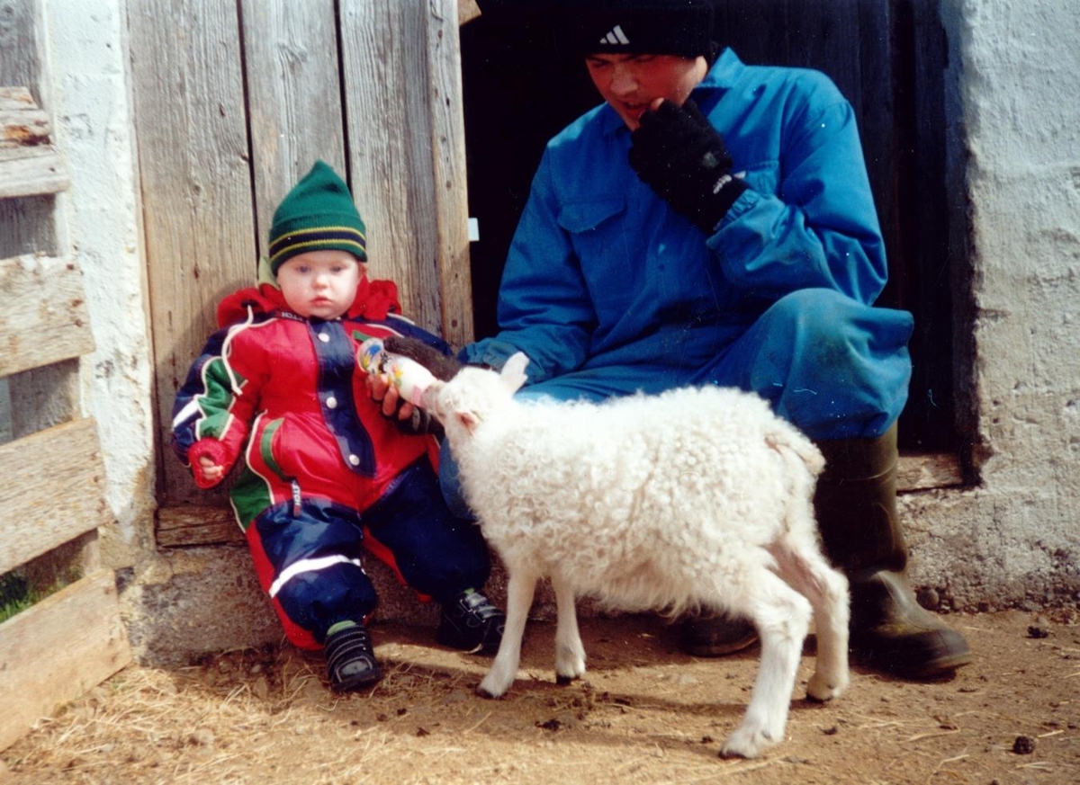 Maður gefur lambi úr pela. Lítið barn situr hjá.