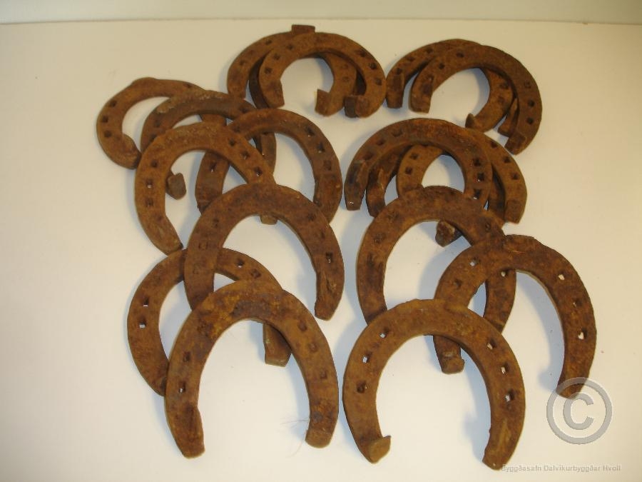 Nítján skeifur í plastpoka. Á miða sem var í poknanum ásamt skeifunum stendur að þær séu heimasmíðaðar en ekki smiðurinn nefndur á nafn.