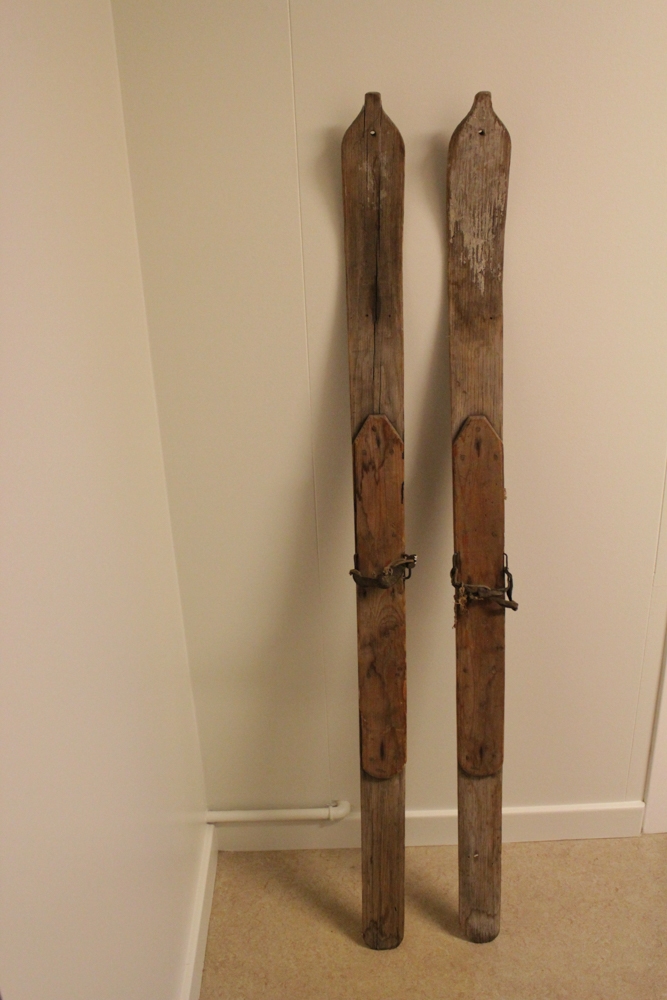 Skíðin átti fyrstur Sigurjón Jónsson, héraðslæknir í Svarfdælahéraði 1908-1938.Þetta eru barnaskíði með bindingum úr leðri yfir ristina. Um miðbik skíðanna hefur verið bætt spítu og hefur það verið til að styrkja skíðin. Samkvæmt heimildarmanni sem vann við skíðasmíði hér á árum áður þá voru þessa styrkingar nefndar klampi. Í hliðum efri spítunnar eru járnlykkjur og þar í gegn ganga leðurbindingarnar. Þær eru festar saman með reipi. Annað skíðið er 144 cm a lengd og hitt 143,5 cm.