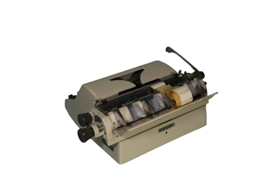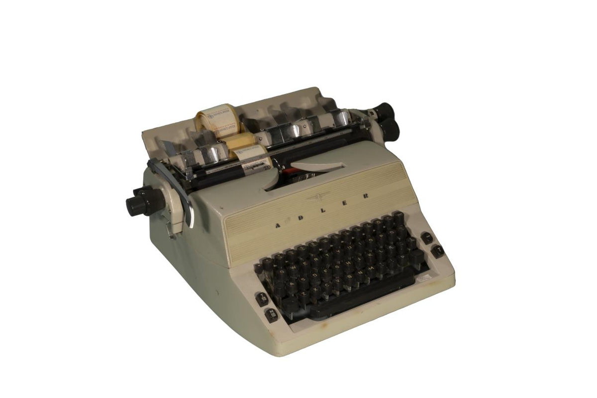 Ritvél af Adler gerð sérstaklega gerð fyrir að skrifa miða til að merkja meðöl og lyf. Úr eign Akraness Apótek