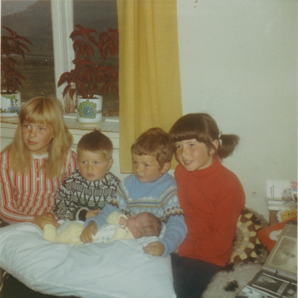 Myndir af systkinunum í Steinadal á Ströndum, Jóhanna Signý nýlega fædd, frá vinstri Hrafnhildur, Jón, Jón Gísli, Svanhildur.