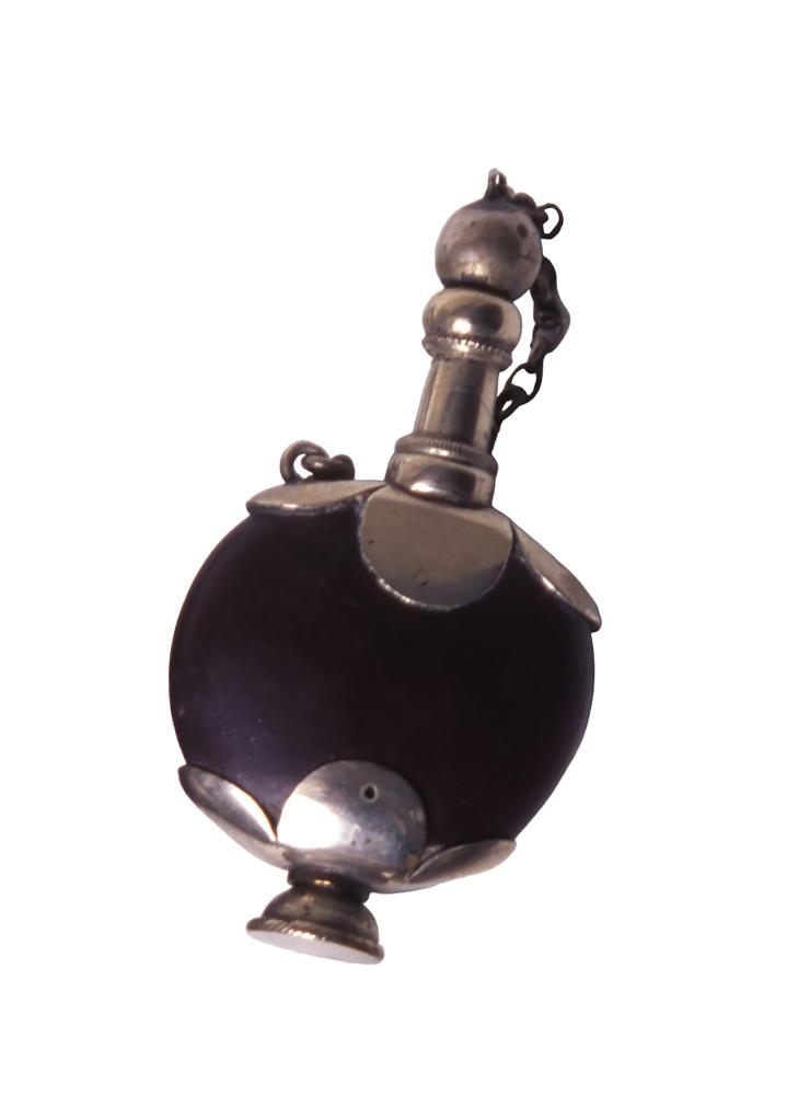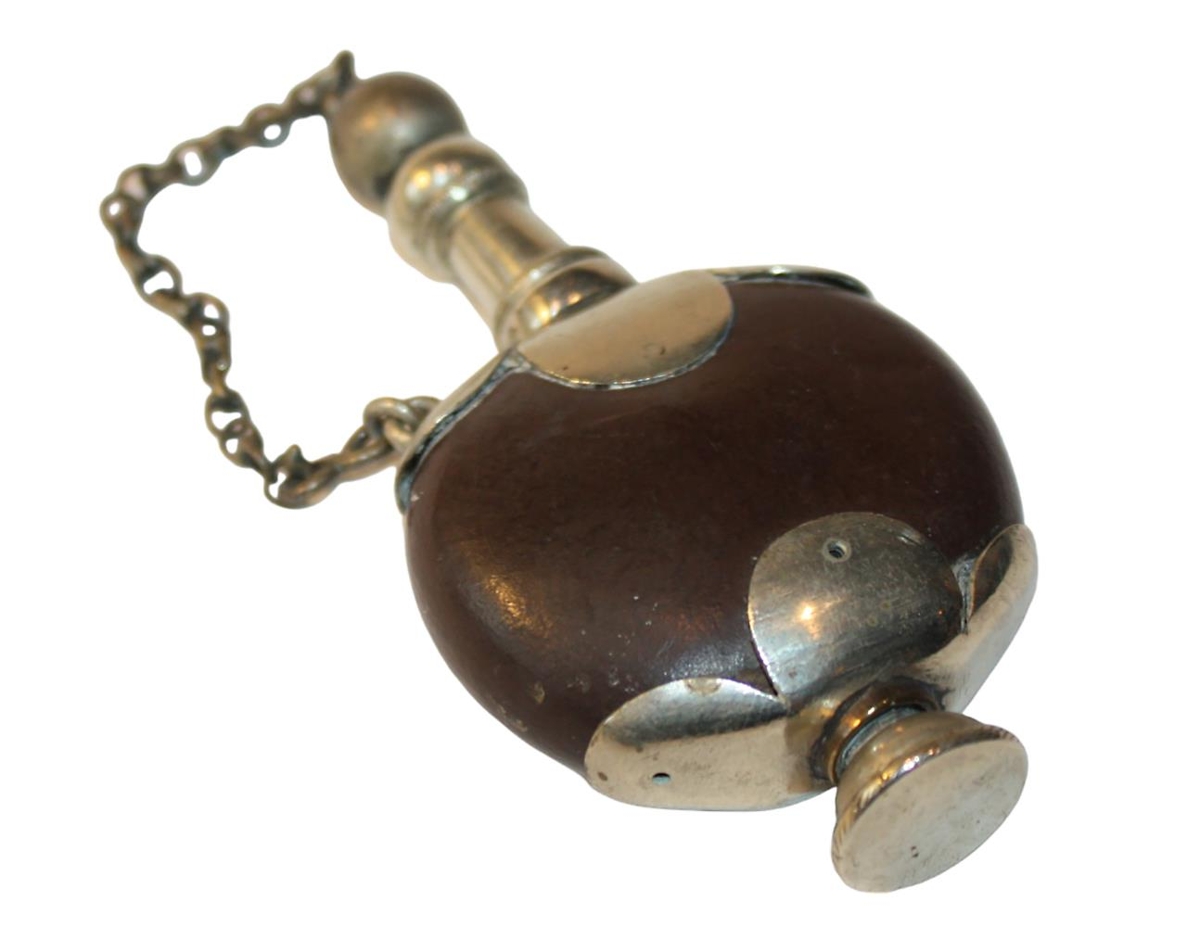 Tóbaksbaukur úr harðviði. Baukurinn er silfurbúinn.