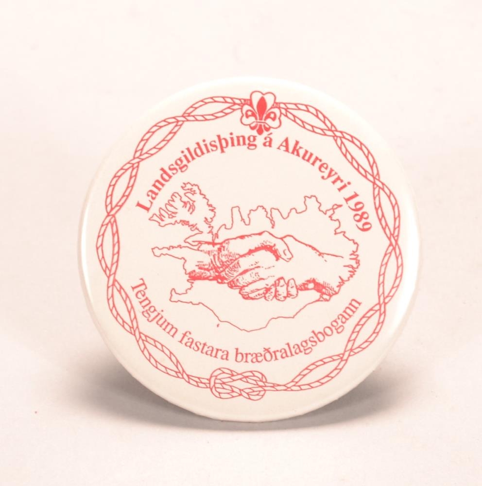 Hvítt kringlótt barmmerki með rauðum stöfum, merkjum og myndum. Merki St. Gildanna efst á miðanum, kaðlar með hnút í miðju umlykja mynd af Íslandi og hendur sem heilsast ásamt textanum: „Landsgildisþing á Akureyri 1989. Tengjum fastara bræðralagsbogann.“