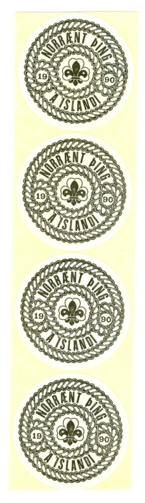 Hvítur kringlóttur límmiði með svörtu letri, merki og myndum. Merki St. Gildanna í miðjunni, kaðlar umlykja miðann og merkið og textann „Norrænt þing á Íslandi 1990“