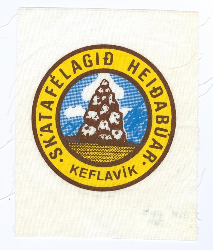 Kringlótt merki skátafélagsins Heiðabúa í Keflavík. Merki félagsins í miðjunni og textinn „ Skátafélagið Heiðabúar Keflavík“ á gulum grunni utan um það