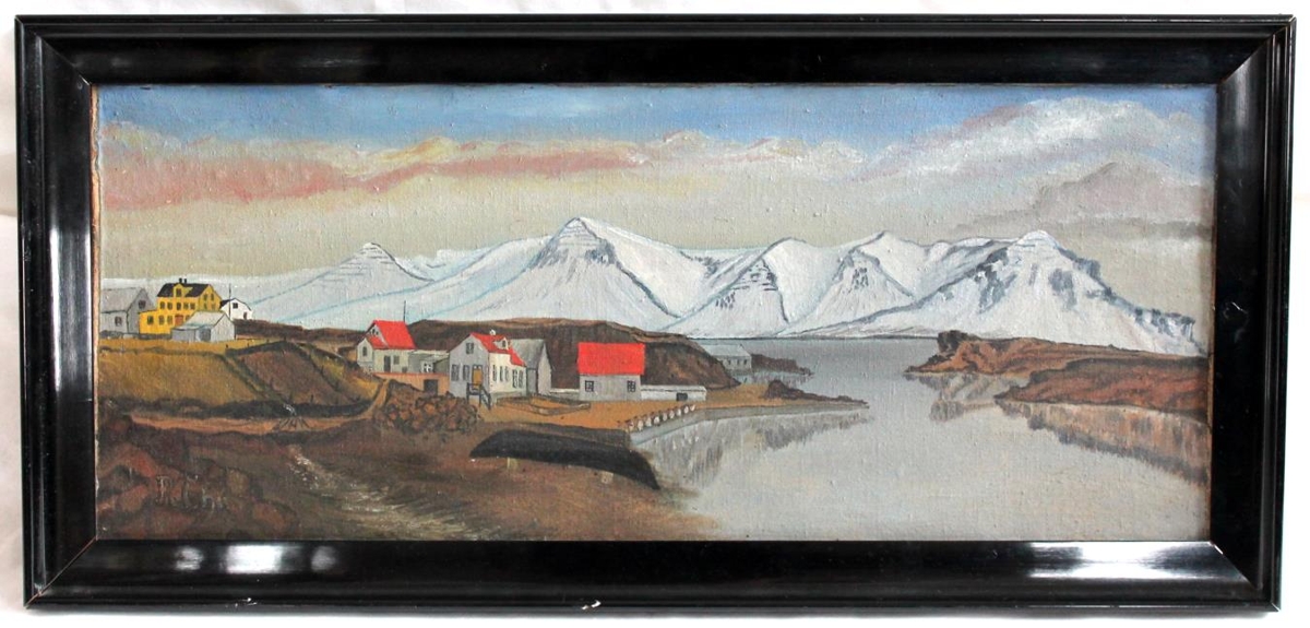 Málverk eftir Reinhard Christiansen, af gömlu kaupfélagshúsunum í Borgarnesi.