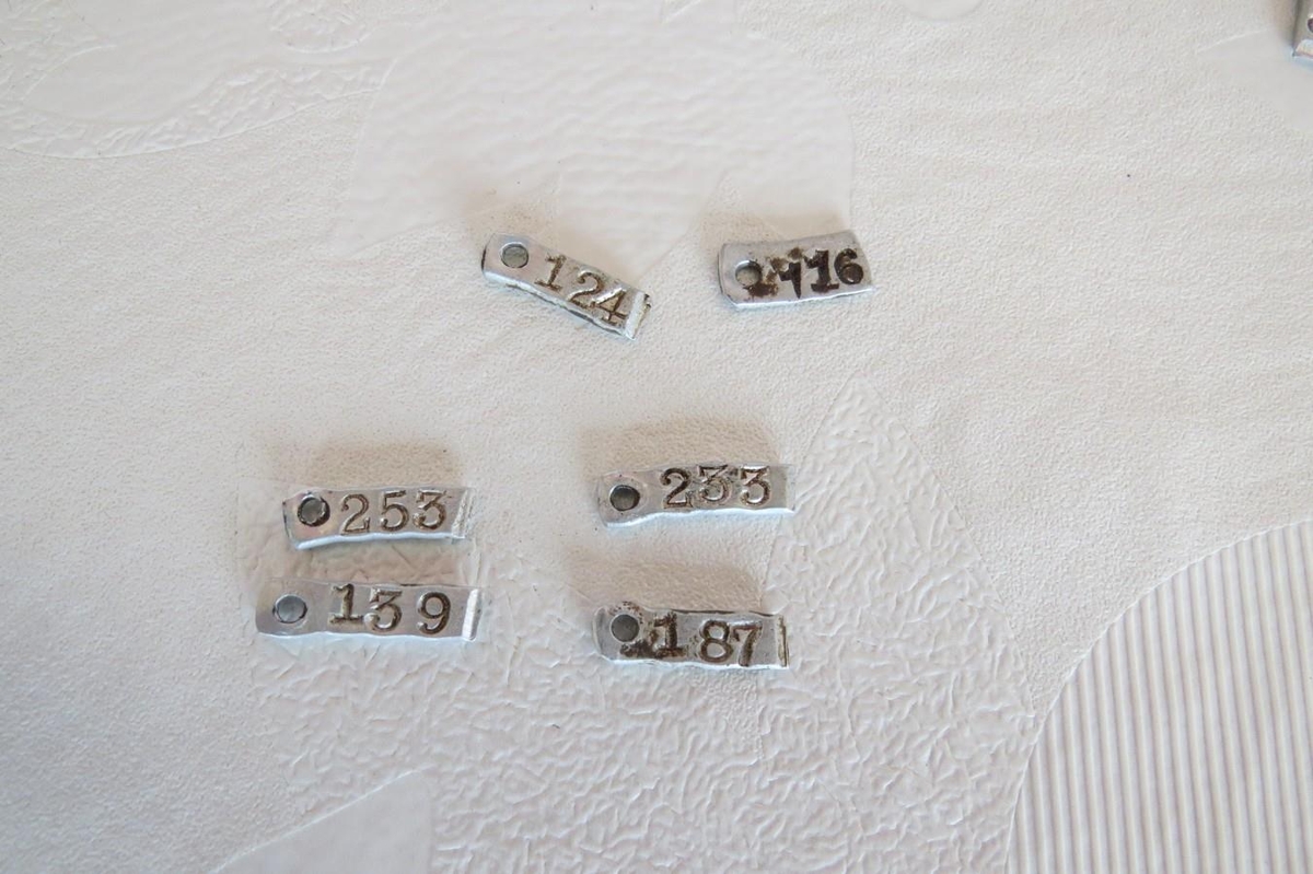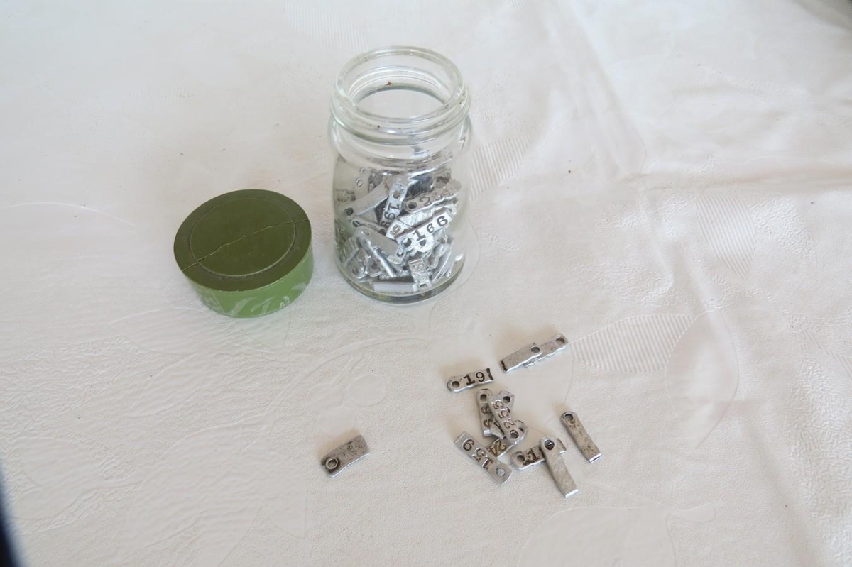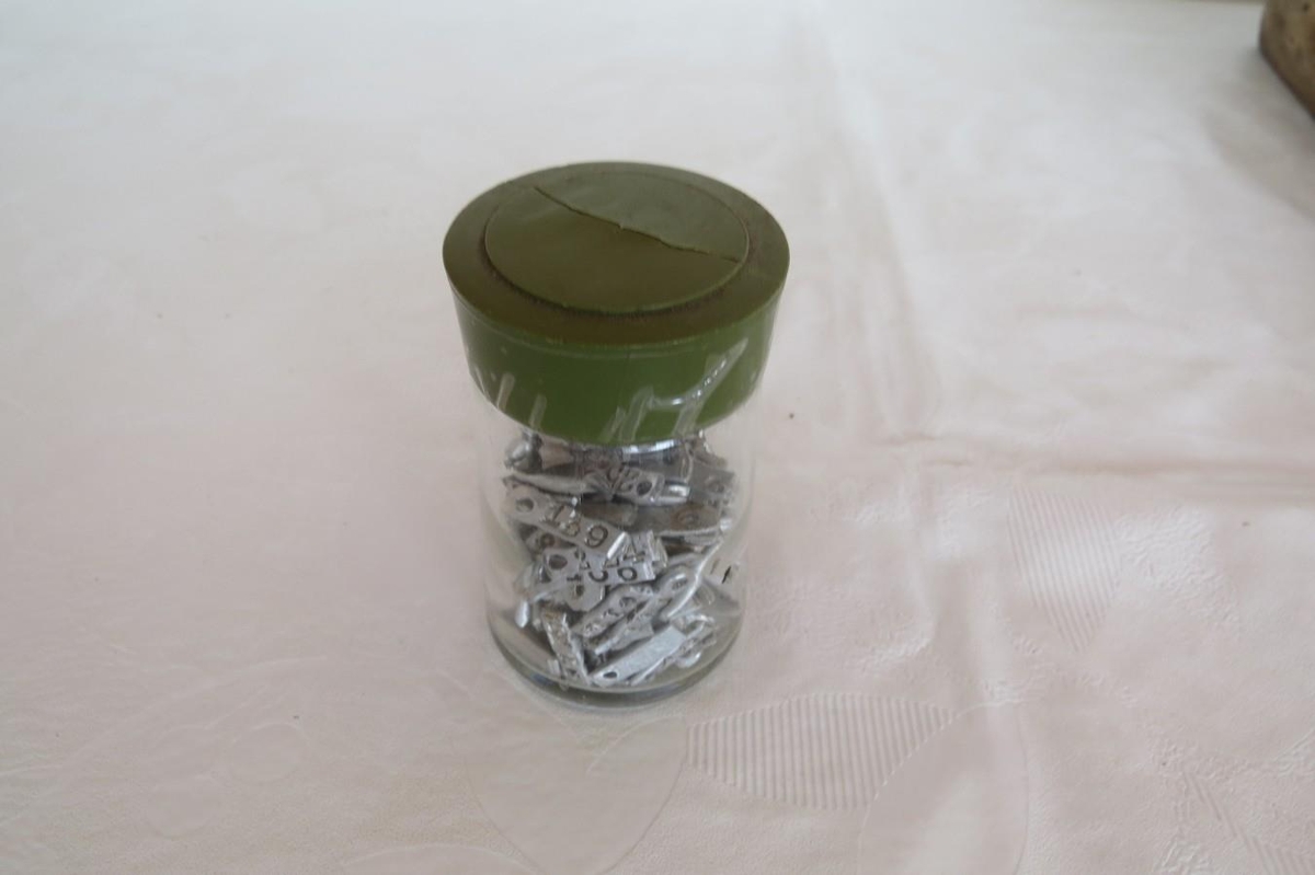 161 lítil notuð álmerki úr lömbum sem komu í glerkrukku með brotnu plastloki sem límt var saman.
