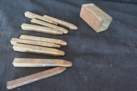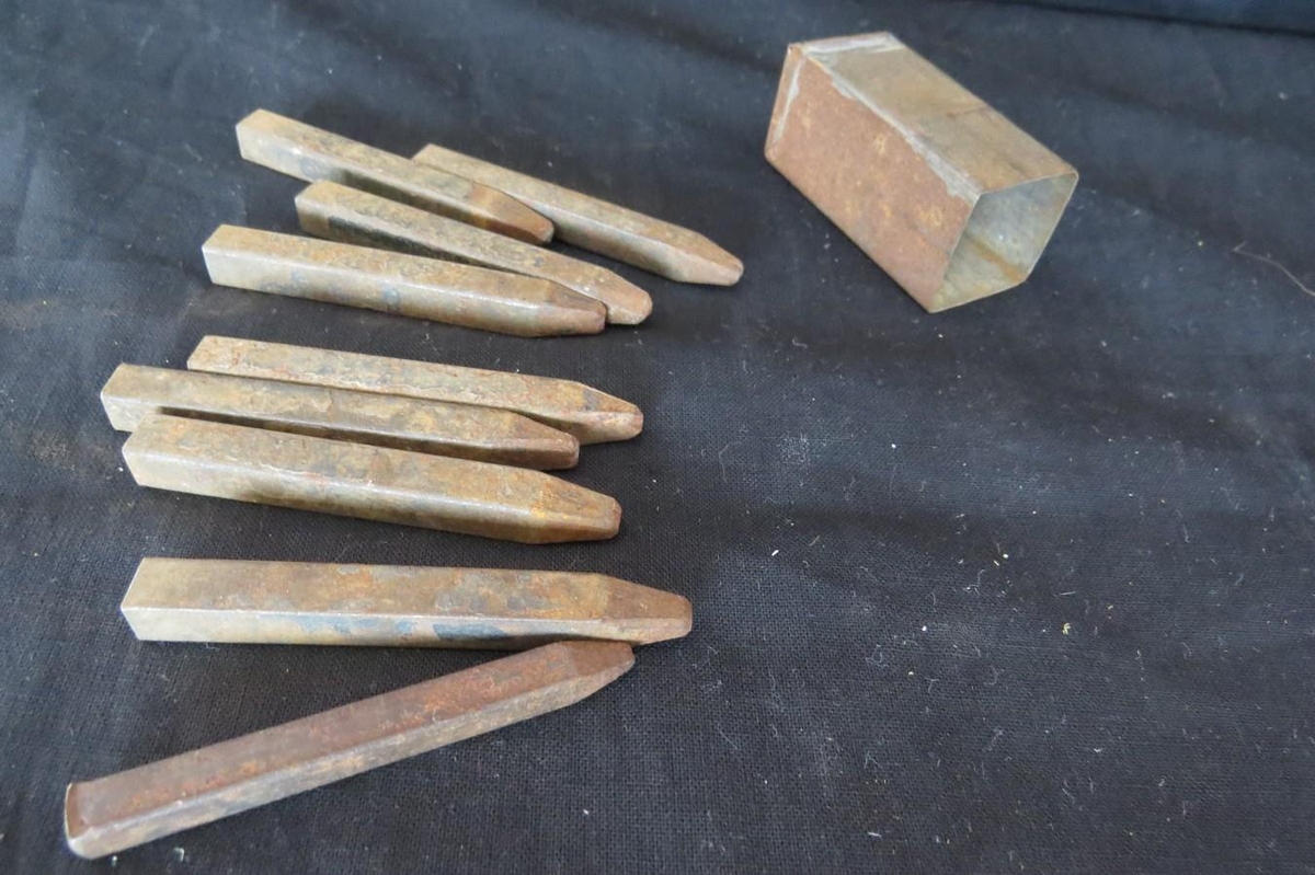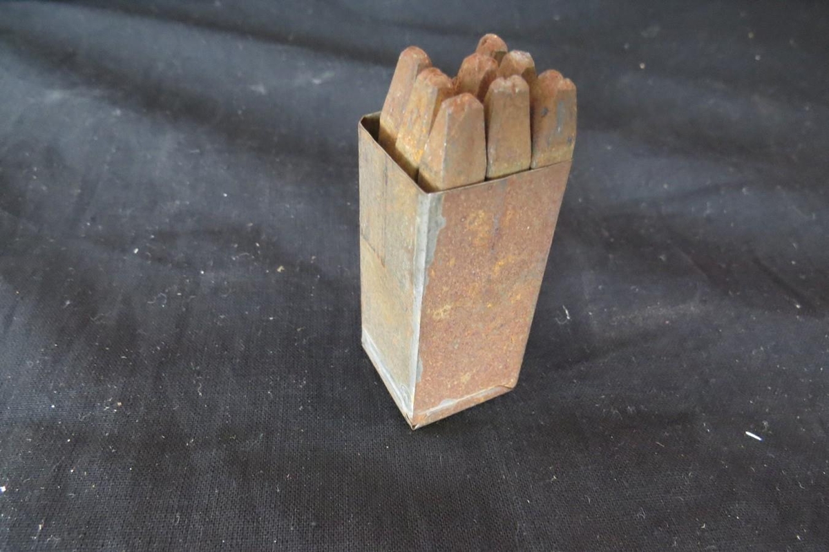 Níu númerastenslar úr járni í litlu járnboxi. Þeir voru notaðir af Jóni Jónssyni frá Broddanesi til þess að númera fjármerki sem hann bjó til úr áli.