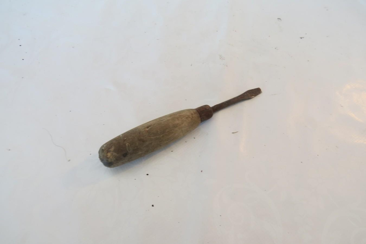 Gamalt skrúfjárn með viðar handfangi. Kemur frá Lyngholti á Snæfjallaströnd.