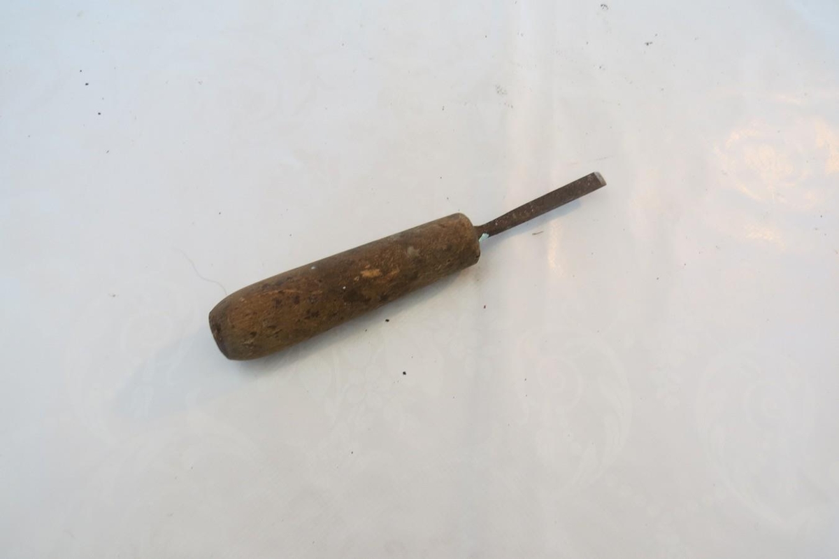 Gamalt sporjárn með viðar handfangi. Frá Lyngholti á Snæfjallaströnd.