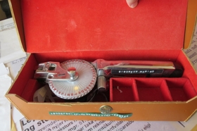 Stór merkibyssa, af gerðinni Dymo, sem prentar á límmiða. Hún er með hjóli sem er notað til þess að velja stafi. Á byssunni eru ýmsir límmiðar. Sitthvoru megin á handfanginu á henni eru límmiðar sem standa á "Siguröur Marínó" og "Helgi Sigusson". Fyrir neðan hjólið er límmiði sem stendur á "Helgi og Siggi eigaötta". Neðan á byssunni er svo límmiði sem stendur á "Sigurdur Mægi Gardarsson".