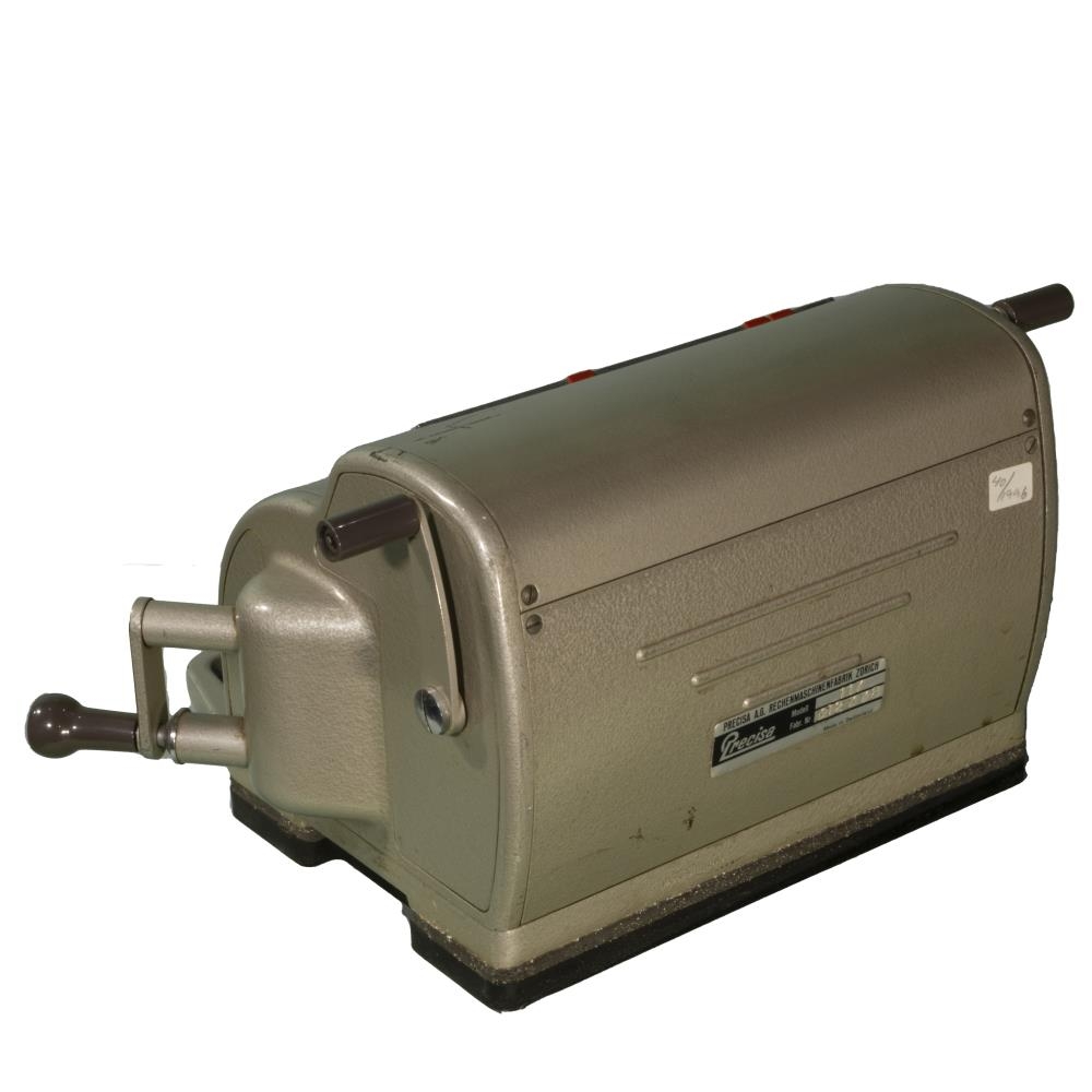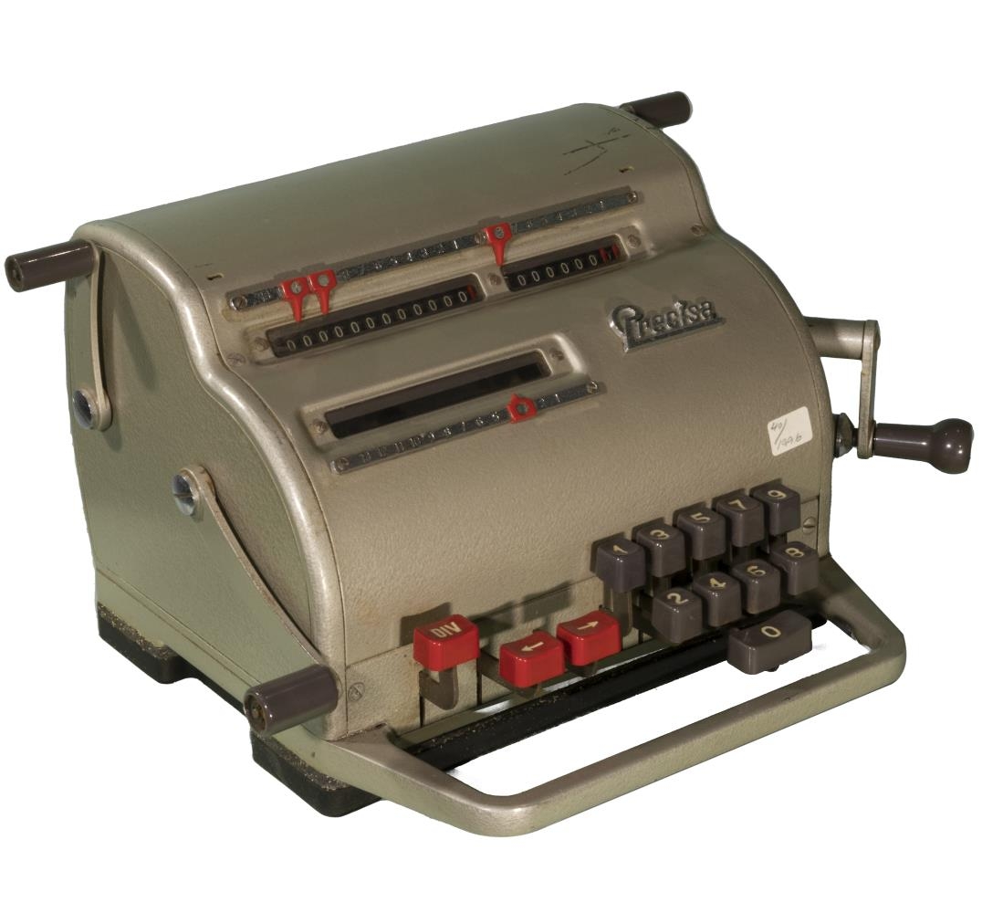 Reiknivél af gerðinni PRECISA model 117 með snúningssveif, ljósgrá á lit. Úr eign HB og Co.